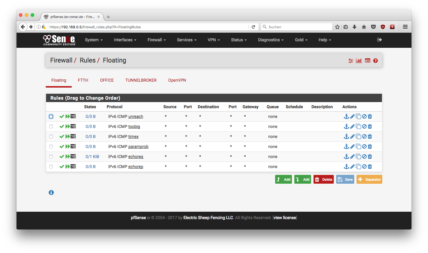Die RFC4890 sagt ganz klar, welche ICMP-Nachrichten eine Firewall nicht verwerfen darf. PFSense bringt diese Regeln aber nicht von Haus aus mit. Also selber bauen: