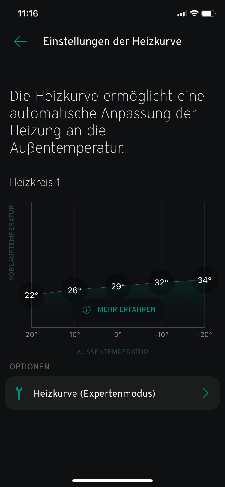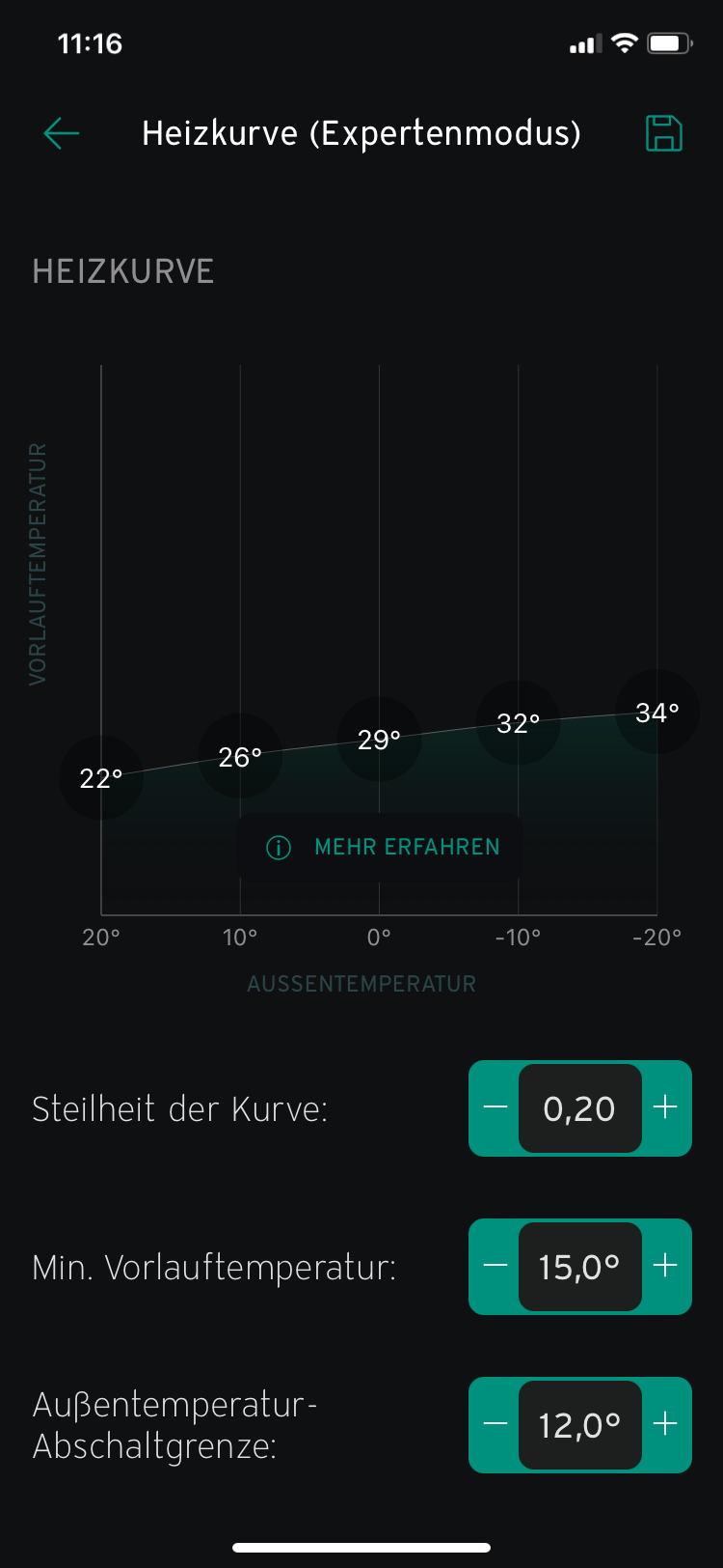 Da ist eine neue Version der myVaillant App gekommen. Jetzt hat sie eine grafisch gut gemachte Konfigurationsmöglichkeit für die Heizkurve bekommen: